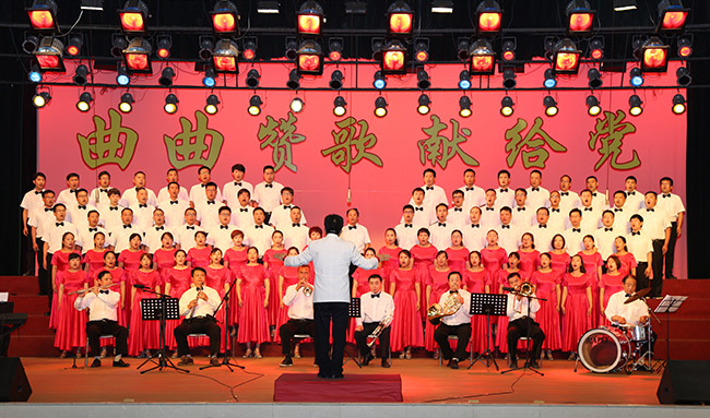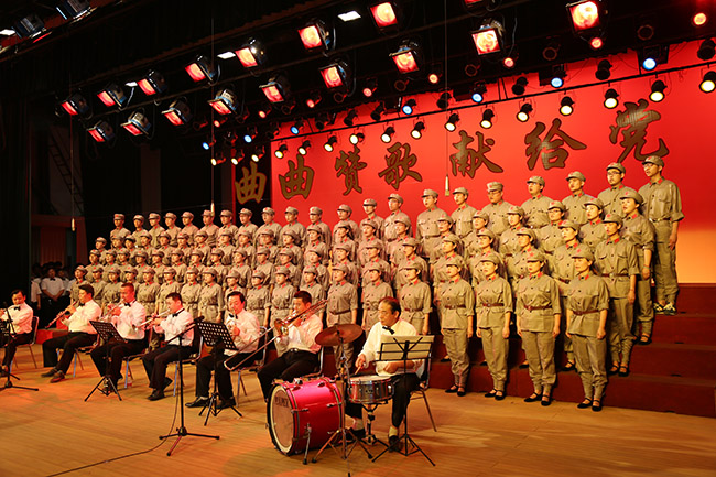 最后,集團(tuán)公司工會副主席賈志成上臺指揮,臺上隊(duì)員和臺下2000多名觀眾全體起立,共同唱響《沒有共產(chǎn)黨就沒有新中國》,現(xiàn)場紅旗舞動,歌聲洪亮,將整臺演出活動推向了高潮。